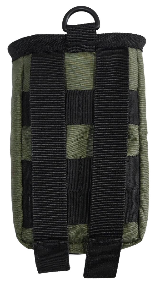 背面は、MOLLEシステムが付いているので、MOLLEシステム対応のものに取りつける事が出来ます。上部には、巾着が付いているので、飛び出し防止の役割も果たします。