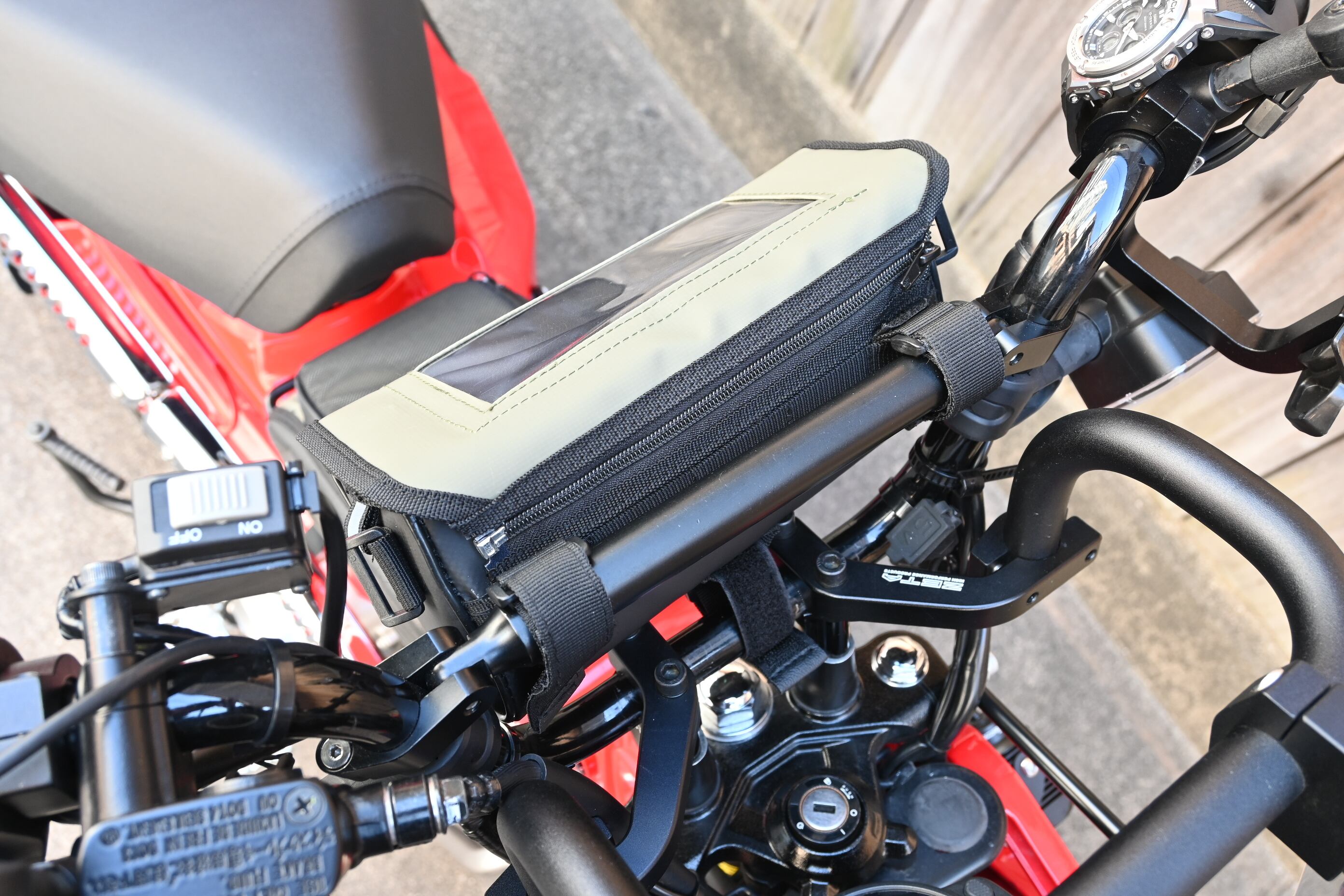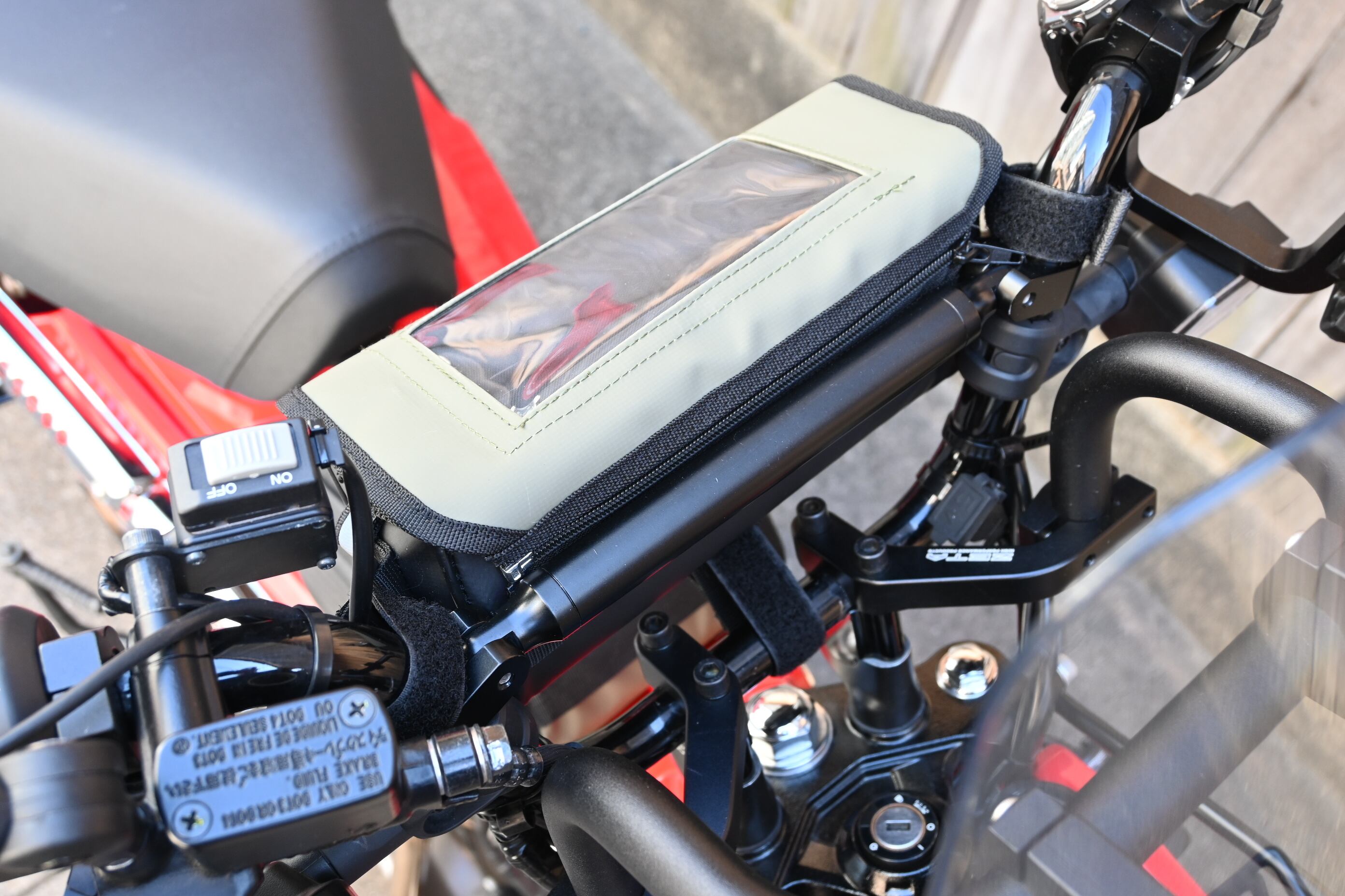ハンドルバーバッグは、ハンドル部分に固定する専用バッグのことです。ターポリン素材を使用しているので、耐久性があり防水性も兼ね備えています。荷物をハンドル部分(前側)に収納できるので、リアのキャリアバッグのように物を取り出すときにバイクから降りなくても取り出せる利点があります。