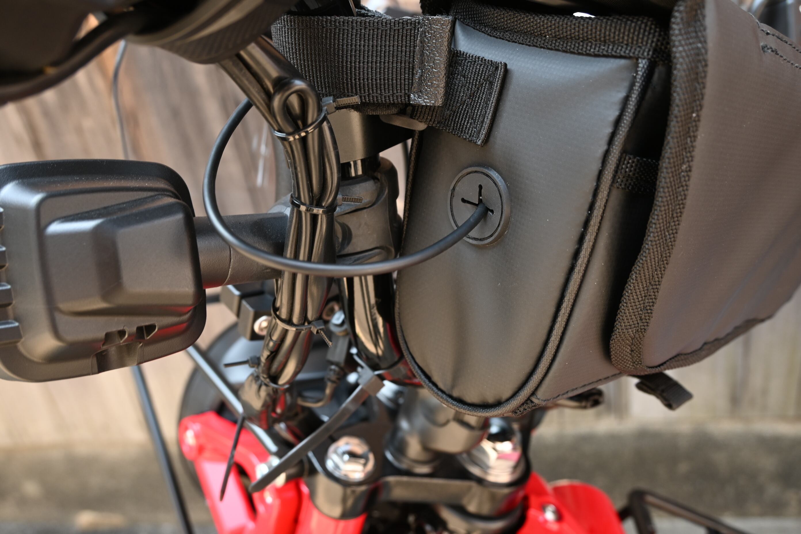 USB電源装置から充電できるように左ハンドル側にUSBケーブル(Lightning/MicroB/Type-C)などが通せるようになっており、スマートフォンを入れながら充電することが出来ます。スマートフォン以外にも、バイクで持ち運びたい小物類(600mlのペットボトル1本)を収納できるスペースがあります。内側は、アルミの蒸着があるので、保冷・保温効果があります。吊り下げポケットが付いているので、保冷剤を入れておけば保冷を持続することが出来ます。真夏の炎天下で高温環境に置かれたスマートフォンは、放熱することが出来ず高温になりやすくなりますが、吊り下げポケットに保冷剤を入れておくと少し抑制することが出来ます。(※結露には注意してください。)