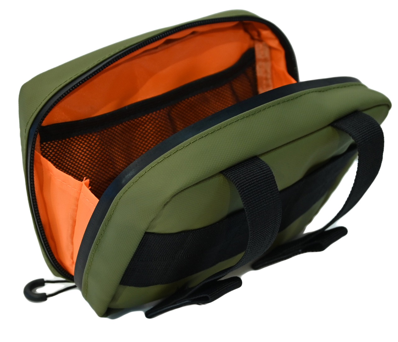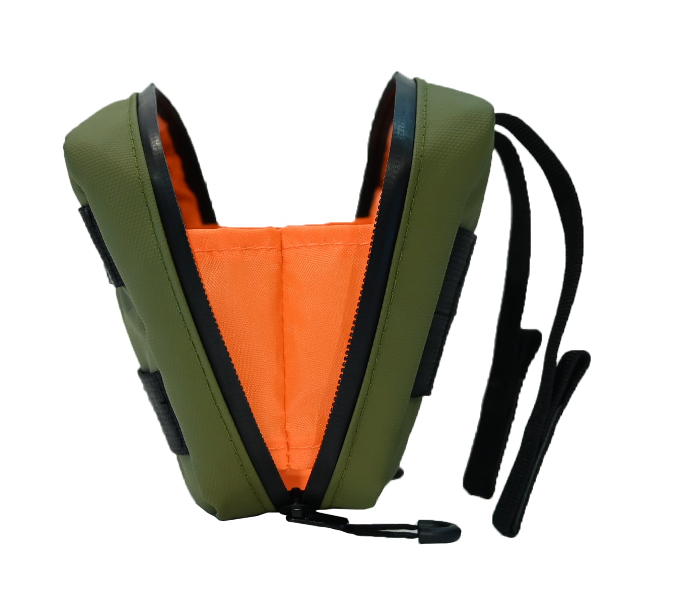 基布は600Dナイロンオックスで、表面はPVCコーティング(撥水加工)を施しています。ファスナーは止水ファスナーを使用しているのでちょっとした雨風に対応できます。(※完全防水ではありません。)